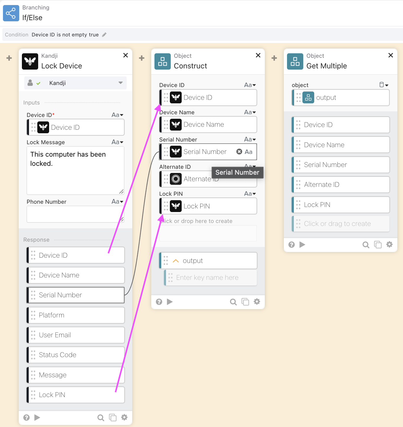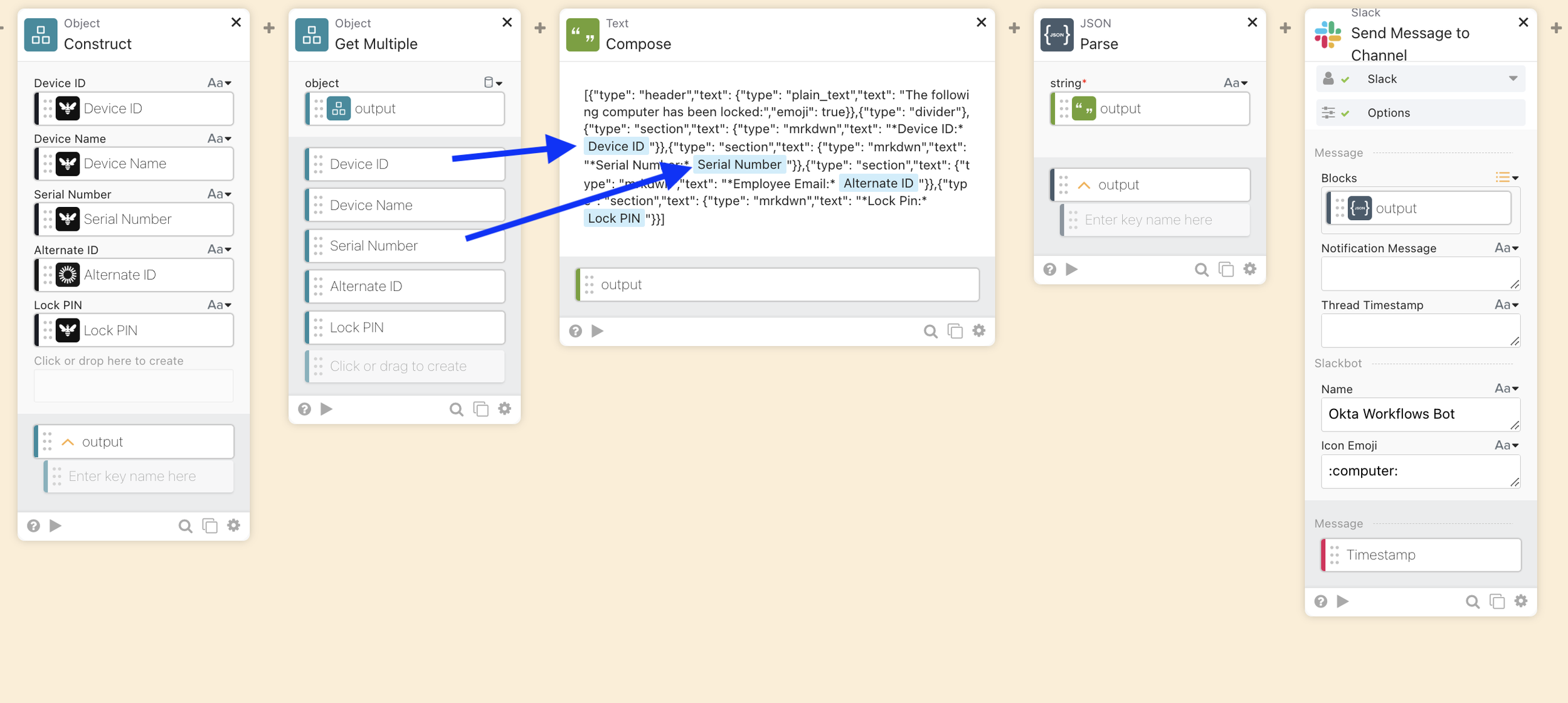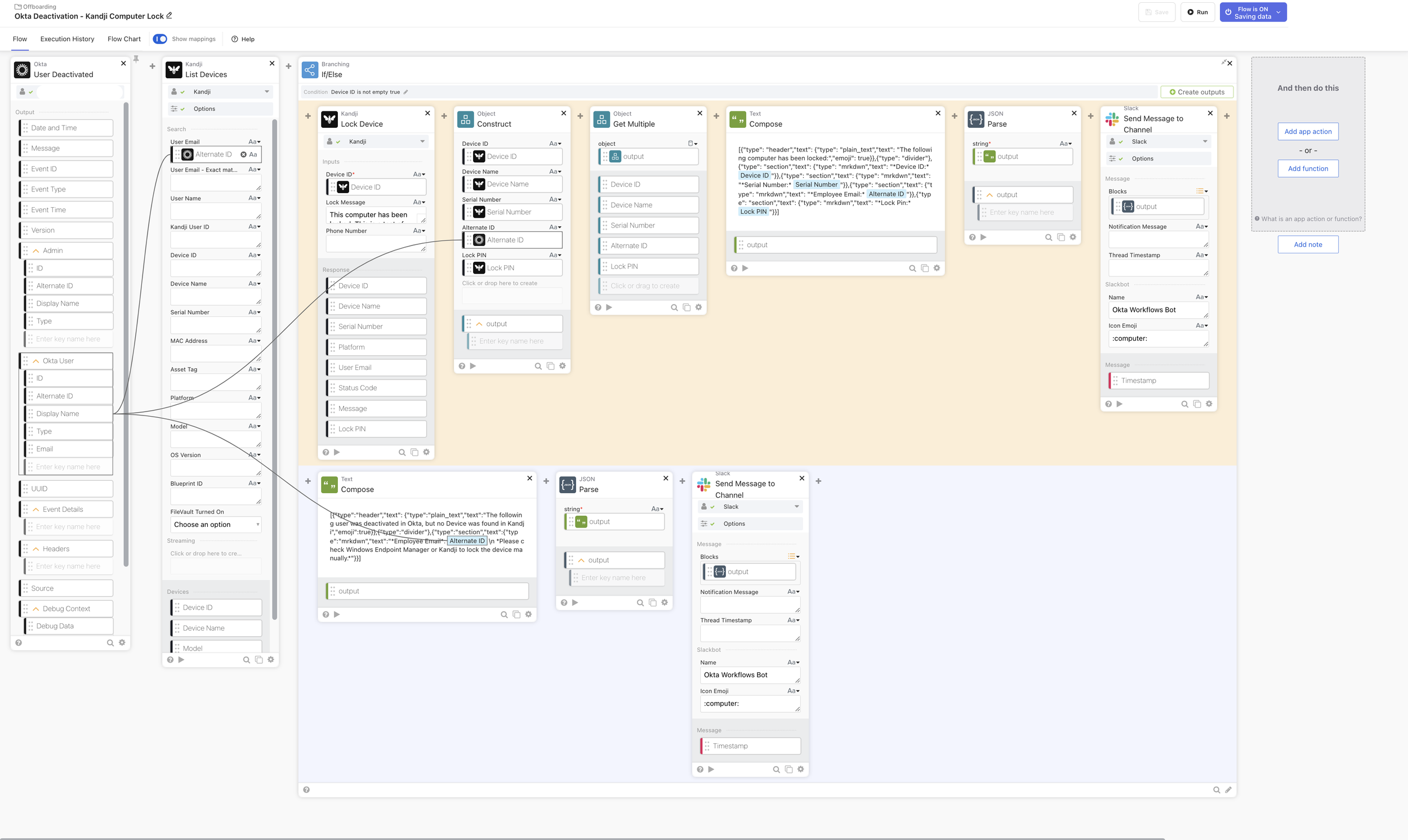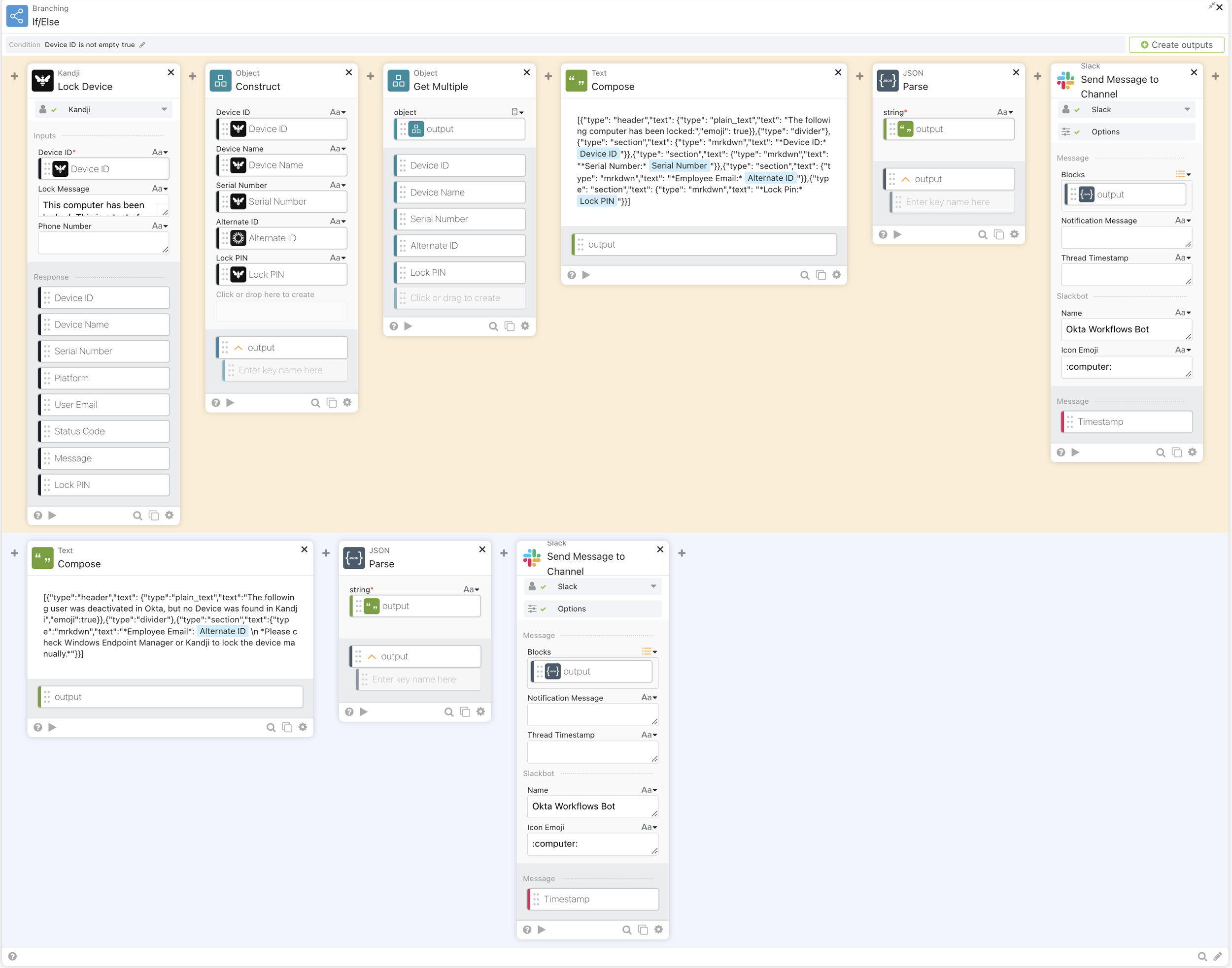 Once the lock action runs, you’ll get a payload back from Kandji in the output/response of the Kandji: Lock Device workflow card. We’ll use “Object: Construct” to create a nice JSON object from the data returned in the lock step. Extract what you need: device name, serial number, assigned user, status—whatever makes your Slack post look impressive. Some of the data even can you even come from the initial steps of user deactivation.
