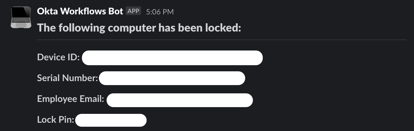 If the condition passes, the workflow then runs the “Kandji: Lock Device” action. This is where the magic happens. You can also include a custom lock message like: